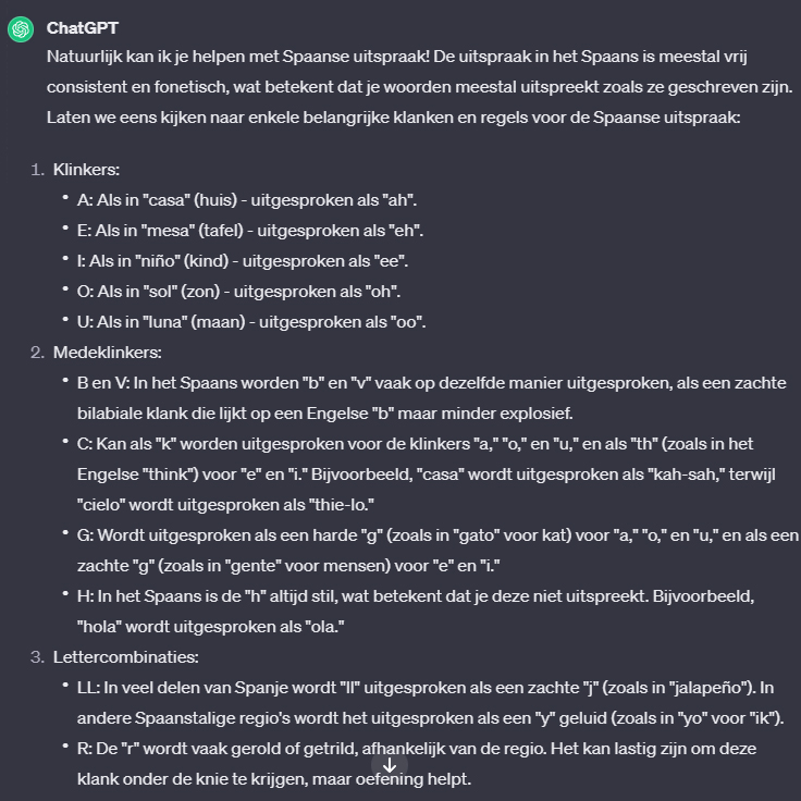 Ontmoet Sam, een ambitieuze student die droomde van tweetaligheid. Met ChatGPT oefende hij dagelijks Spaans, verbeterde hij zijn grammatica en verfijnde hij zijn uitspraak, allemaal in een veilige, oordeelvrije omgeving. En er is meer: ChatGPT inspireerde hem om creatieve verhalen in zijn nieuwe taal te schrijven, wat zijn taalvaardigheid verder verrijkte en zijn creativiteit aanwakkerde.